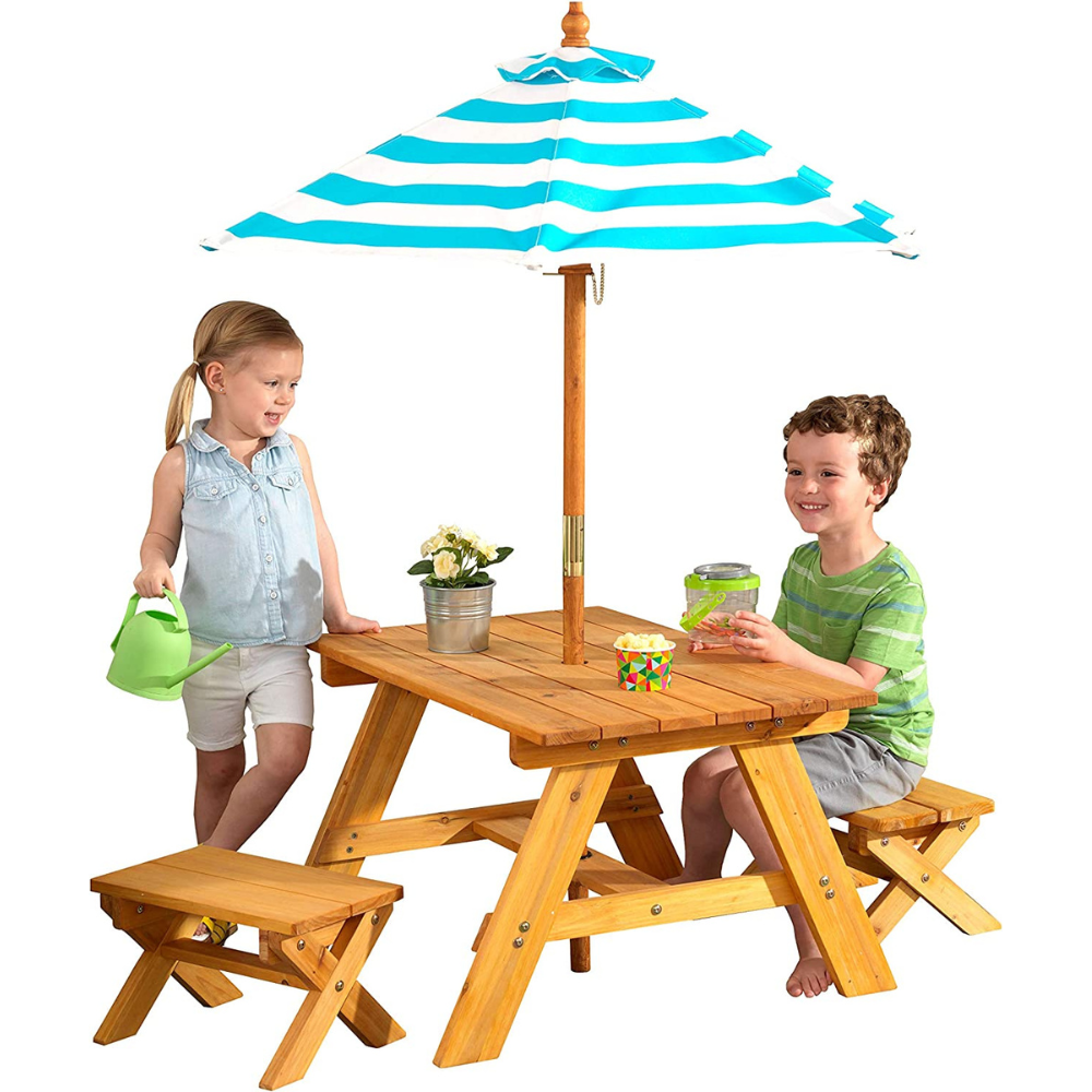 The set comes with a folding umbrella, so your kiddos can enjoy a picnic, play games, or do arts and crafts outside while staying protected from the sun.